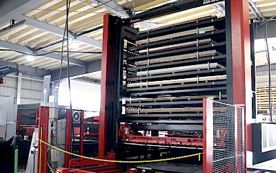 【メーカー:AMADA】ASR-Nは、1棚内に素材と製品用のパレットを格納するモデルです。 素材の搬送と加工後の製品を自動で集積するため、連続運転が行えます。